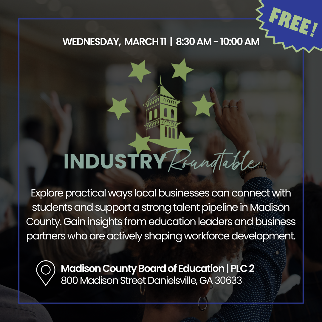Join us for FREE one-hour roundtable at PLC 2, Madison County Board of Education, where local businesses and educators will explore practical ways to connect with students through job shadowing, internships, apprenticeships, and other work-based learning opportunities. Networking begins at 8:30 AM, and the discussion starts promptly at 9:00 AM.