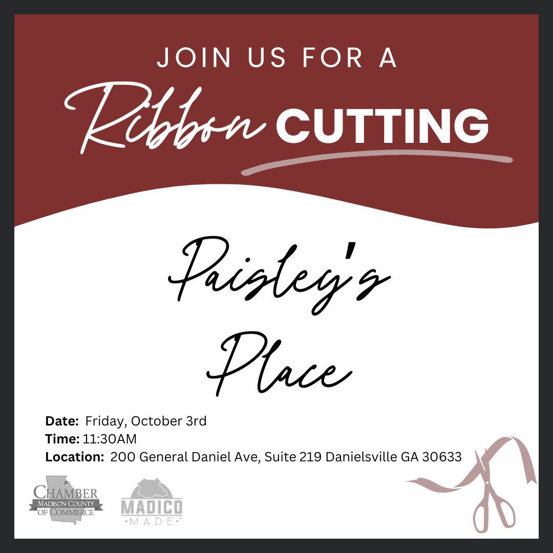 Join the Madison County Chamber of Commerce as we celebrate the grand opening of Paisley’s Place, a wonderful new addition to the Madison County dining scene! Come show your support for this exciting new restaurant and take part in the ribbon cutting ceremony. You’ll also get to hear the inspiring story behind Paisley’s Place their mission, vision, and passion for serving the community. We hope to see you there as we welcome Paisley’s Place to Madison County!